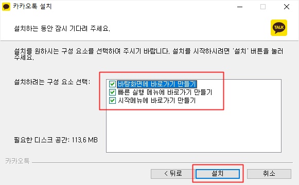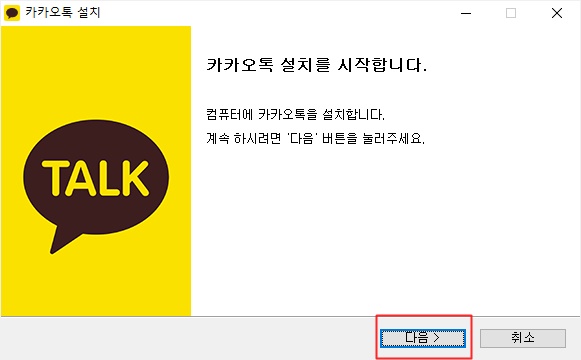 컴퓨터에 카카오톡을 설치합니다. 계속 하시려면 '다음'버튼을 눌러주세요.