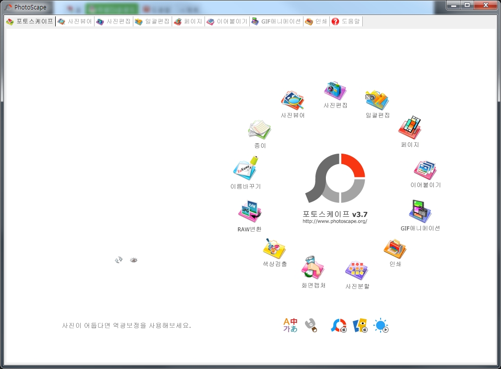 위의 이미지를 잘 보면 사진 뷰어, 사진펴집, 일괄편집, 페이지, 이어붙이기, gif애니메이션, 인쇄, 사진분활, 화면캡처, 색상검출, raw변환, 이름바꾸기, 종이 등 다양한 메뉴들이 준비되어 있습니다. 포토샵 처럼 보다 전문적인 프로그램을 다루기 힘들분들이 사용하기에 딱 좋게 만들어 놓았습니다. 저도 포토스케이프를 이용한지 6년째가 되어 갑니다. 시간이 정말 빠르네요, 포토스케이프로 블로그 활동이나 홈페이지 활동을 잘 하고 있으며 회사, 집 등 무료로 다운받아서 바로바로 사용하기 좋아서 굉장히 유용하게 사용하고 있습니다.