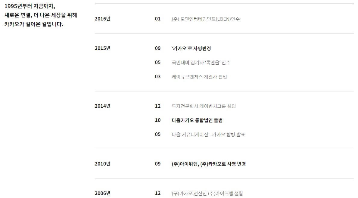 1995년부터 지금까지, 새로운 연결, 더 나은 세상을 위해 카카오가 걸어온 길이라고 합니다. 2010년 탄생하여 2020년 딱 10년이 되는 오늘날 까지 많은 사람들의 일상을 바꿔놓은 우리의 카카오! 앞으로도 계속 사랑해 주실꺼죠?!~