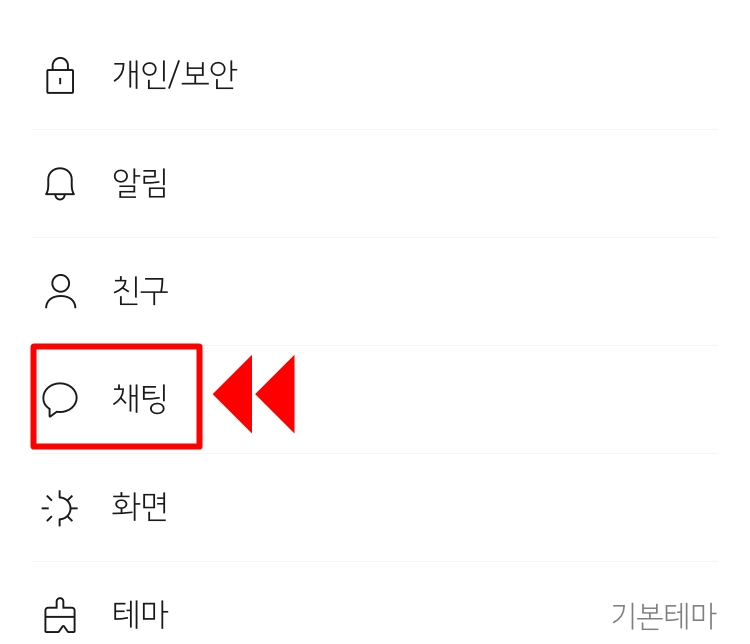 더보기에 설정을 눌러 보면 채팅을 설정하는 카테고리가 있습니다. 채팅을 클릭하거나 터치해 준다면 채팅창에서 사진/영상을 보내는 화질을 개인의 상황에 맞춰서 선택할 수가 있습니다.