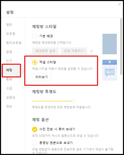 모바일버전에는 없는 기능이 있습니다. 바로 카카오 메신저를 엑셀창으로 보여질 수 있게끔 상사눈치를 덜 보고 업무하는 척? 할 수 있는 카카오 스킨이 있습니다. 일반 버전으로 하면 노란색의 카카오 특유의 색상 때문에 상당히 튑니다. 그런데 전혀 직장인으로써 자연스러운 스킨이 있어서 매우 센스있는 스킨이 아닐 수 없습니다. 회사에서 사용하다 보면 직장 상사나 동료들의 눈치를 좀 볼 수 있는데요 업무중에 메신저로 잡담하는 거를 대놓고 할 수는 없기 때문에 자연스럽게 일은 일대로 하면서 약간의 일탈용으로 사용할 수 있는 카카오 PC버전 스킨은 바로 엑셀 버전입니다. 설정모드에 들어가셔서 설정해서 사용하시면 되는데 방법은 매우 간단합니다. 설정 > 채팅 > 엑셀 스타일 클릭만 해주신다면 바로 엑셀 스타일로 바꿔서 사용할 수 있습니다.
