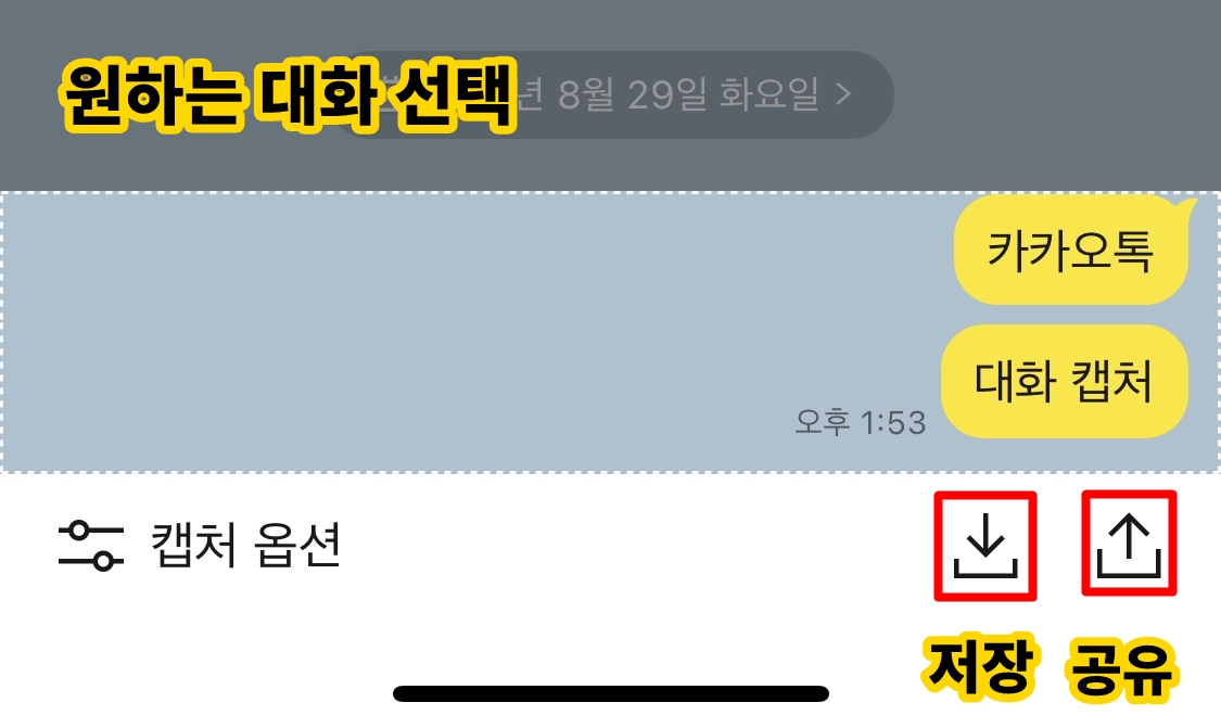 아래 이미지를 참조 하면 원하는 대화를 터치방식으로 하나하나 선택해서 지정한 다음 캡처 옵션을 보면 저장할지 공유를 할지 선택할 수 있습니다.